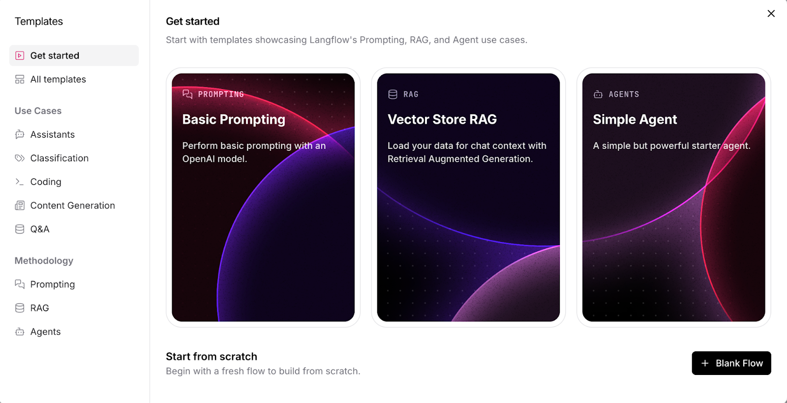 Langflow’s template library of pre-built AI workflows to help you get started.