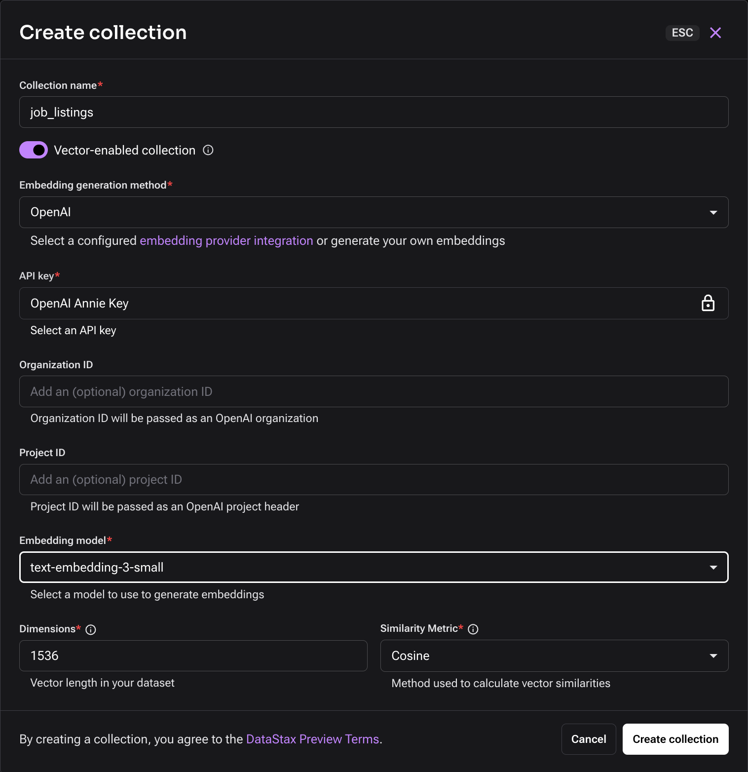 You will see this window come up with an option to configure the details of the collection. Name the collection “job_listings” and select your preferred embedding generation method – in this case, it’s OpenAI’s text-embedding-3-small model. To finish setting up your collection, click “Create collection;” this should take less than a minute to complete.