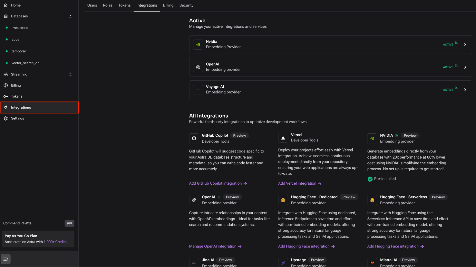 Next you will set up an Integration. You can find the Integrations tab on the left-hand side navigation bar. Astra DB has a selection of integrations that will enable you to use third-party tools and services. For the purpose of this example, you’ll be setting up the Open AI integration to access their embedding models directly from the database.