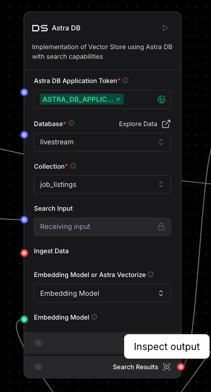 Next, use the Parse Data component once more to parse the results returned from our similarity search to Astra DB. For reference, you can inspect a component to see exactly how the output is formatted by clicking on the icon next to the output: