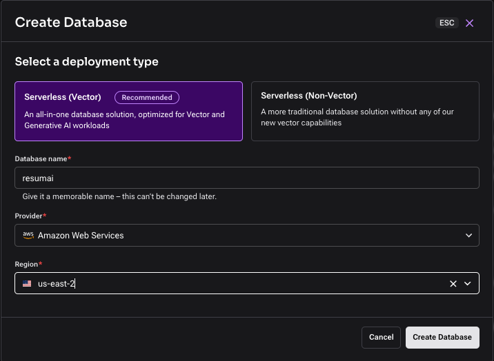 Give your database a name, select your preferred cloud provider, and click “Create Database.” This should take a couple of minutes to spin up.