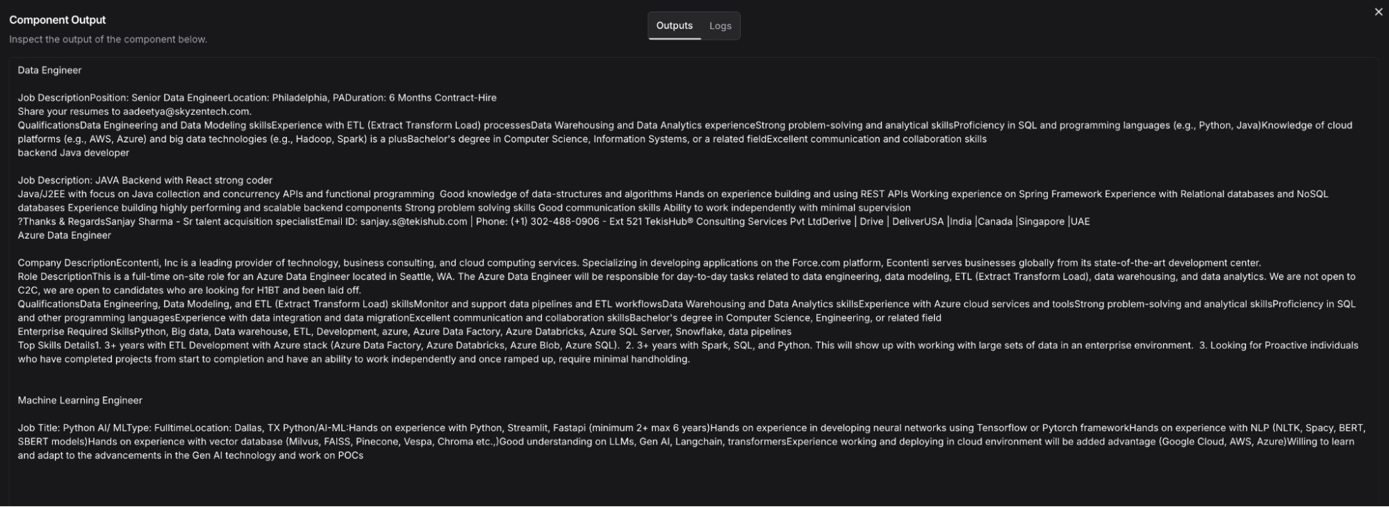 Within the tweaks, you’re passing certain parameters that were retrieved from the user such as the Desired Role and the resume PDF upload to go through the workflow as it was built in the Langflow UI. Finally, you display the results to Streamlit as you did in the Playground using st.button to create a Submit button and st.write to write the final results.