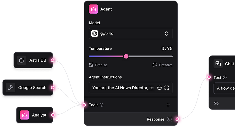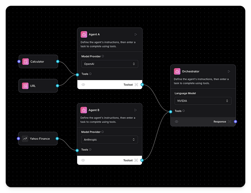 With tool mode, agents can now call other agents as tools, creating a multi-agent system where they can interact and build upon each other. This recursive orchestration enables multi-layered, dynamic problem-solving, where agents can compose complex workflows by calling one another in sequence or nested formations.