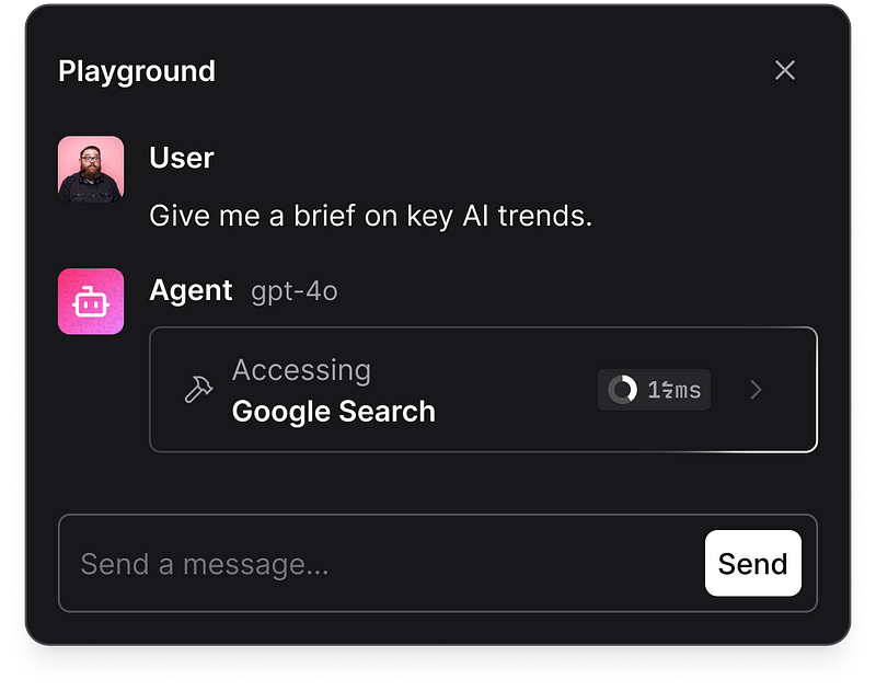 - Collapsible Elements: View intermediate steps and agent actions through collapsible elements, providing a step-by-step view of agent reasoning and tool usage as they’re called.