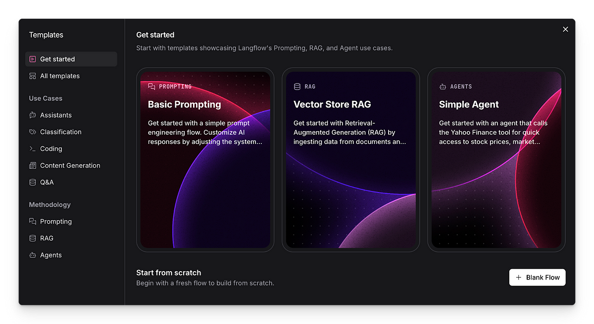 Langflow 1.1 brings a library of pre-built templates categorized by use case and methodology. Jump-start your project by choosing from templates for assistants, Q&A, coding, or content generation. Get hands-on with examples in Prompting, RAG, or a basic Agent setup to dive right in. And stay tuned — we’ll be rolling out many more templates in the coming months!