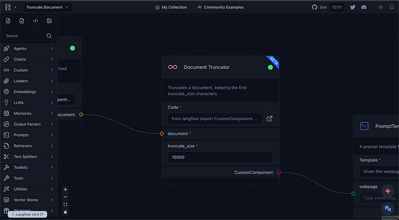 Notice that this component takes a Langchain Document as input, processes the text inside of it, and outputs a Document again, which is then sent to the Prompt Template.