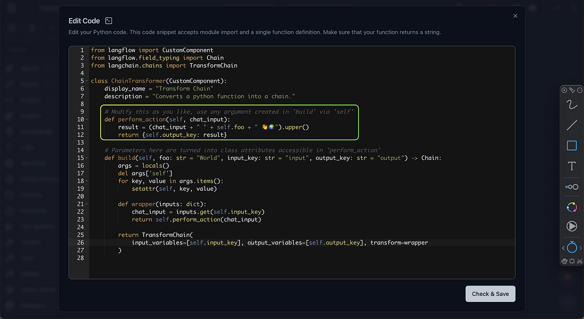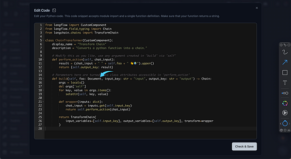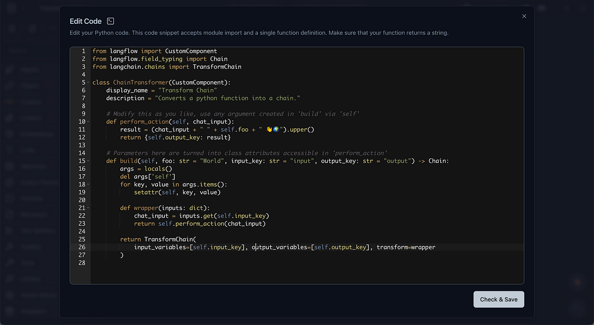 The goal is to bring this Transform Chain feature into Langflow, converting any Python function into a chain type. This allows us to utilize all the chain-related functionalities Langflow offers. For example, they can be used as input to the CombineDocs Chain or Sequential Chains and can work with prompt templates or even open up the chat interface.