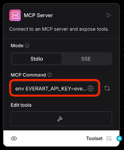 You may find some tools require you to use an environment variable to work. EverArt is an example of this. If that’s the case, just set the variables before you execute the tool command (uvx, npx, docker, etc…) directly in the MCP Command section of the component itself.