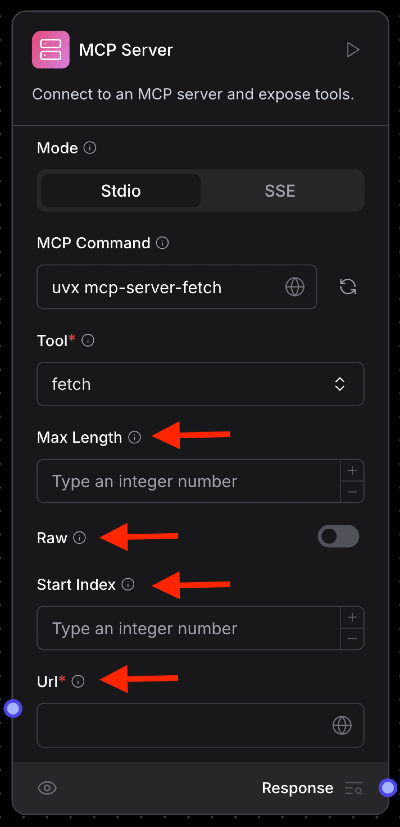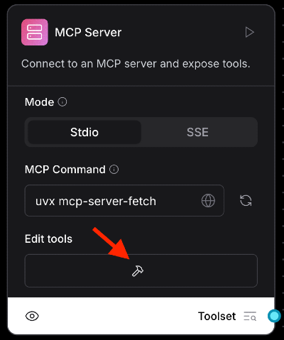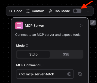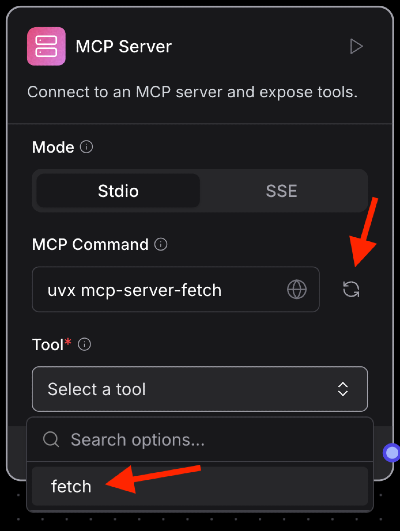 The “MCP Server” component can be used either as a standalone component or as an agentic tool. In either case, just enter in an MCP command or SSE server URL and click refresh.