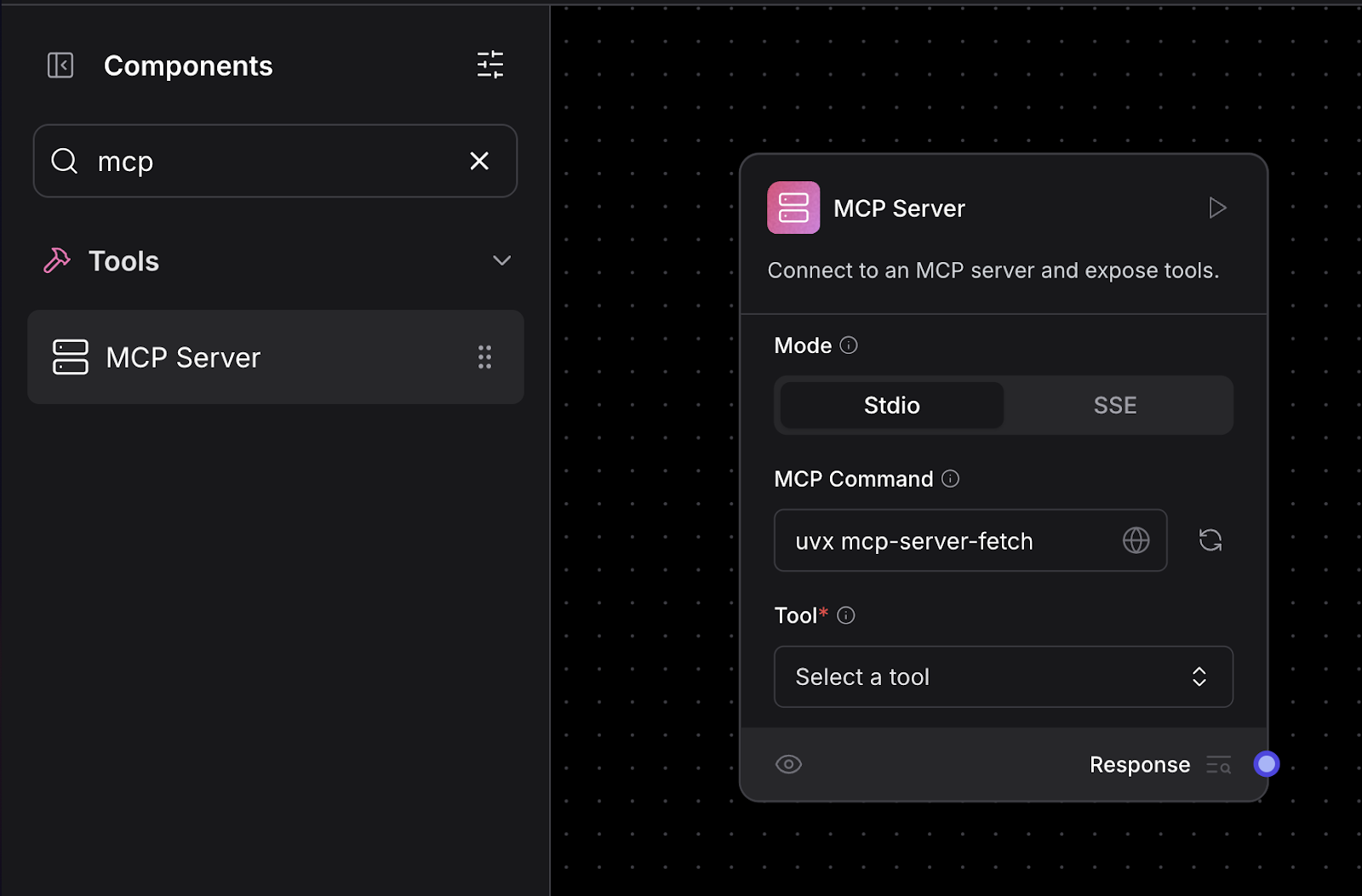 Once you have 1.3, adding an MCP tool in any flow is easy. Just search for “mcp” in the left navigation search bar and drag the “MCP Server” component into your flow.