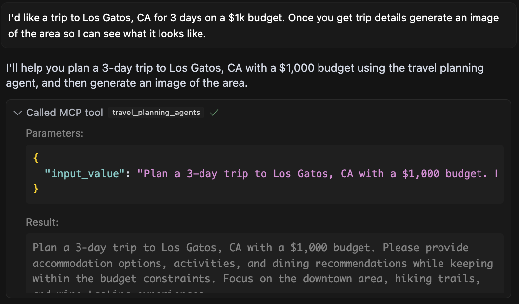 Now, using the EvertArt MCP tool, we can generate images directly in our agentic flows without needing to code up a vision model API in our application.