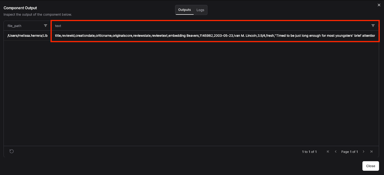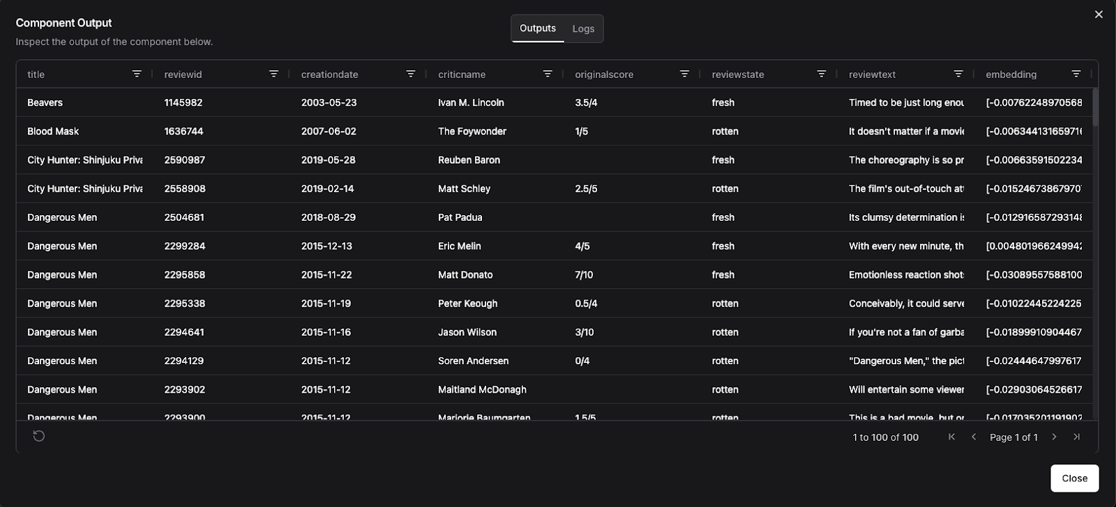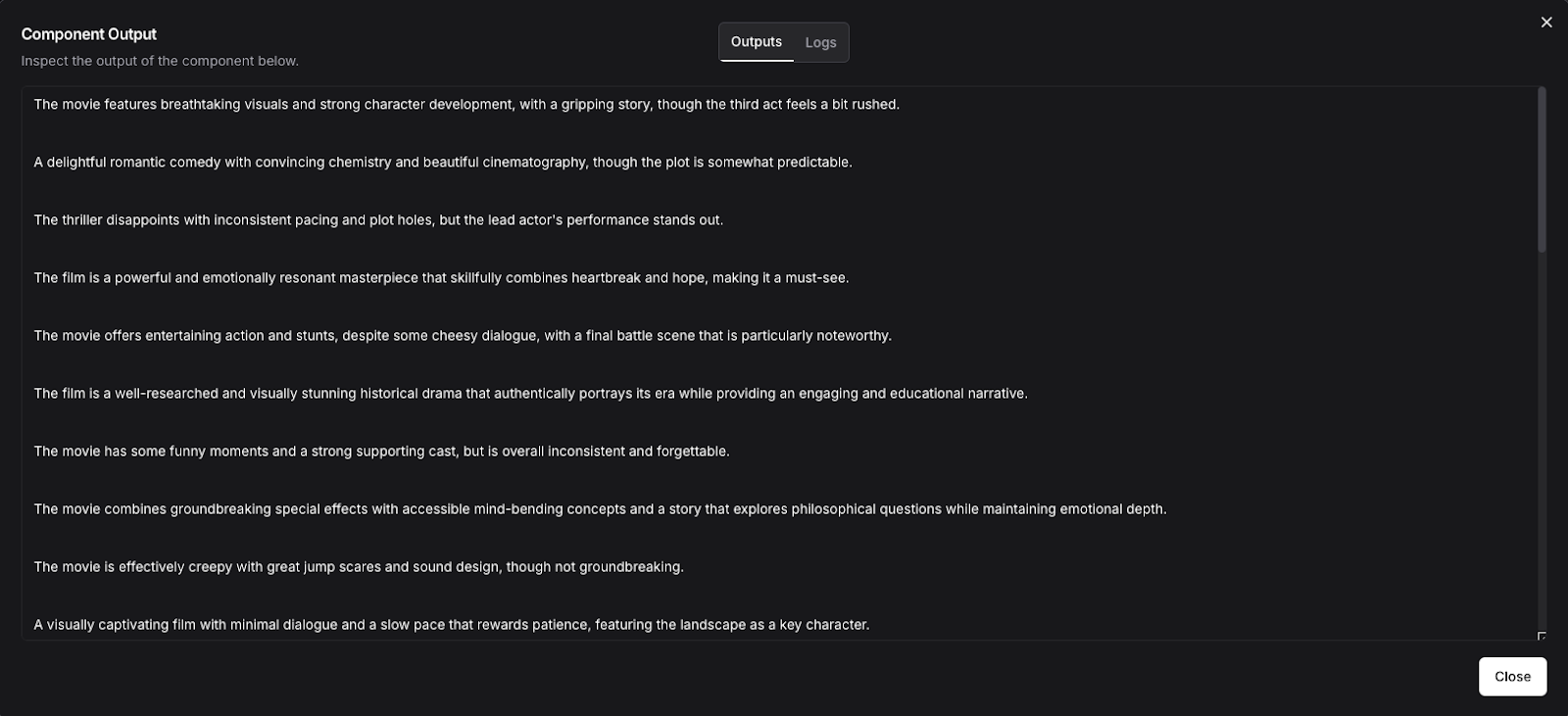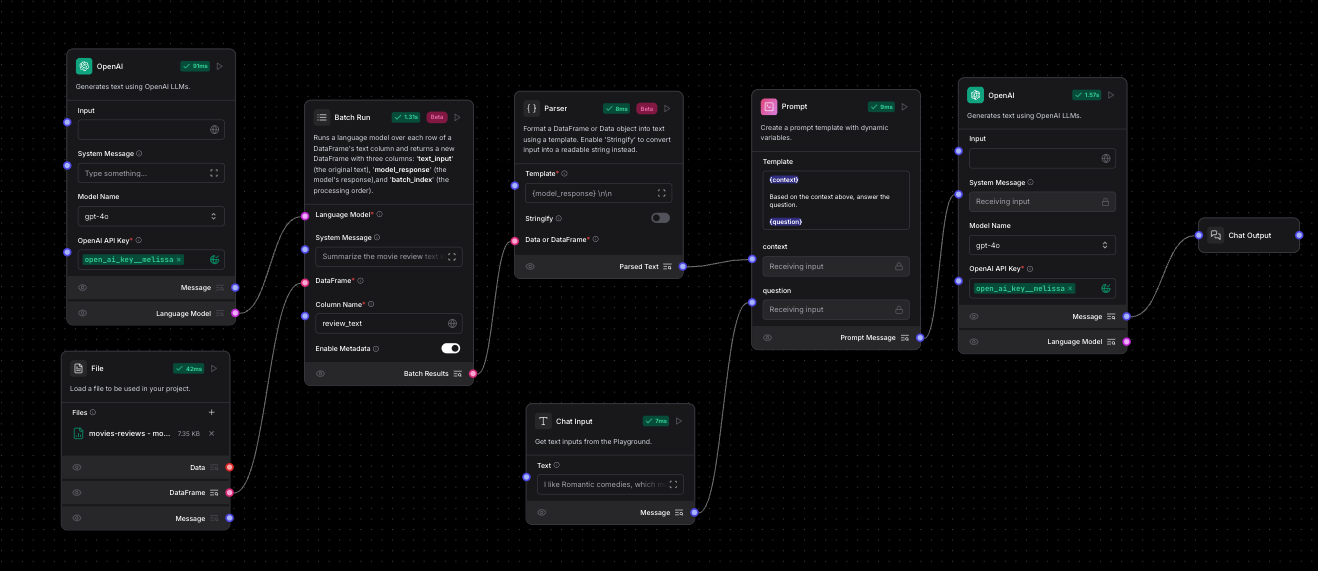 Instead of retrieving the entire movie review, I can now talk to the model directly with the “Chat Input” component, and the model can answer questions based on just the one-liner summaries. It is much easier now to manipulate the different rows and columns in a Dataframe with these updated capabilities and support for CSV in the File component.