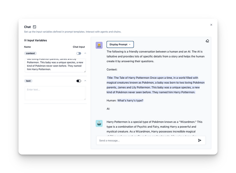In the chat interface, you can redefine which variable should be interpreted as the chat input. This gives you control over these inputs and allows for more dynamic and creative interactions.