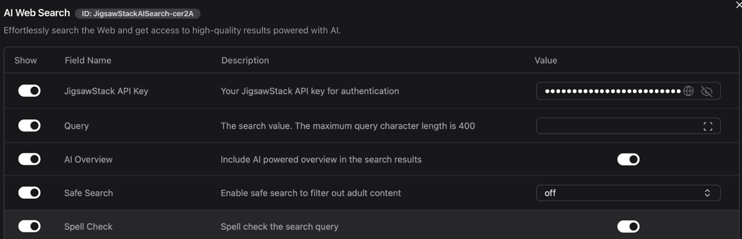 - JigsawStack AI Web Search (Tool Mode): performs live web searches with AI overview. Provided as a tool to OpenAI Agent.