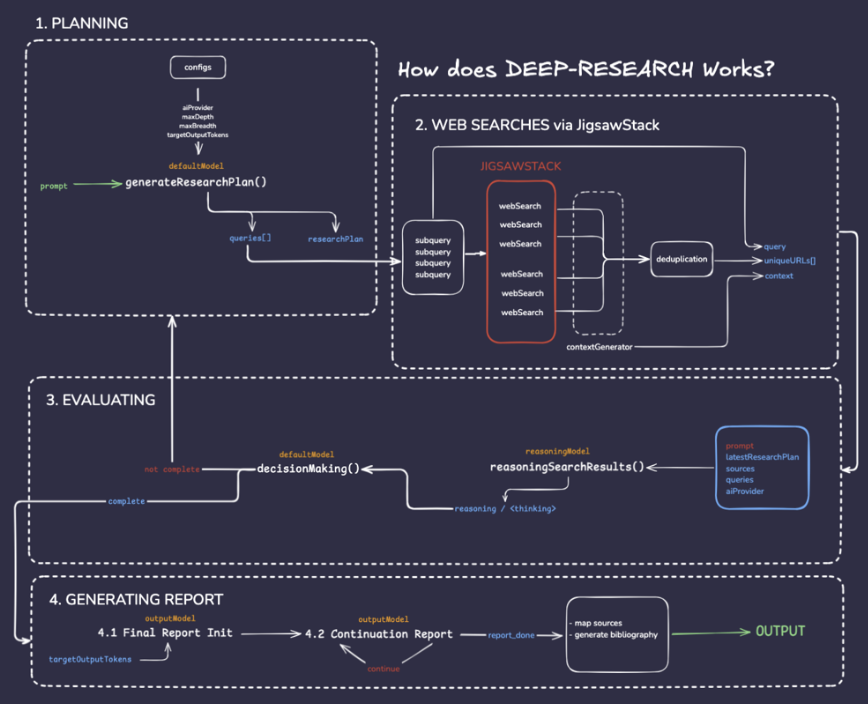JigsawStack's Deep Research is an open-source framework designed to orchestrate the entire multi-hop research process. Under the hood, it combines large language models (LLMs) with recursive web search and structured reasoning to generate comprehensive reports with sources. Here's how JigsawStack performs deep research behind the scenes: