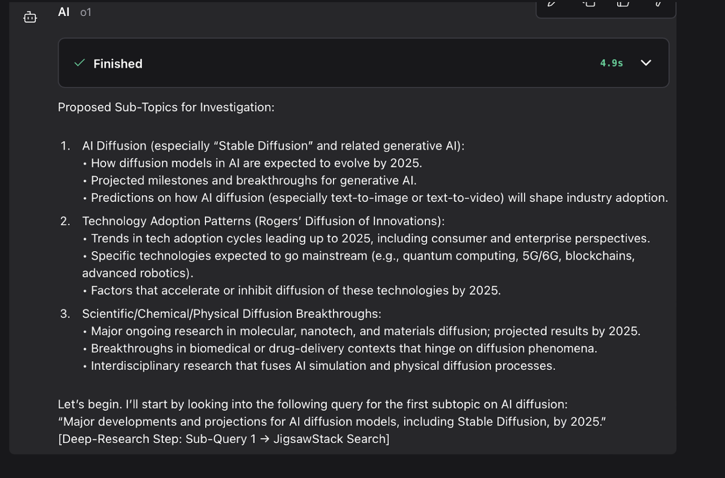 Once the subtopics are identified, the agent begins investigating each one using the JigsawStack Web Search tool.